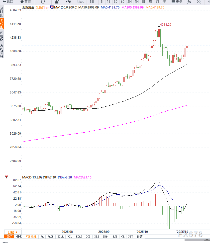 当前价格维持在突破后的高位区间,若金价继续站稳4130美元之上,将有机会迈向下一压力区域4150美元,甚至进一步向4200美元发起挑战。下方支撑位则分别位于4080与4050美元附近,用以确认短线涨势的稳固程度。