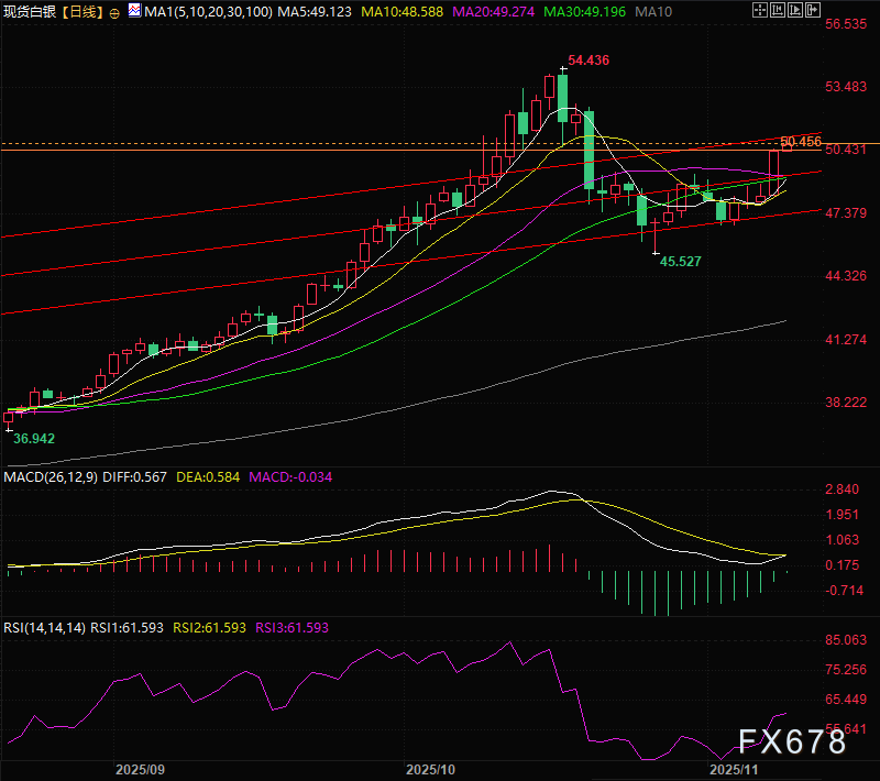 在降息预期驱动下,资金持续流入无息的白银资产,推动其在守住每盎司48美元关键短期支撑位后,反弹突破50美元整数关口,看涨动能持续释放。