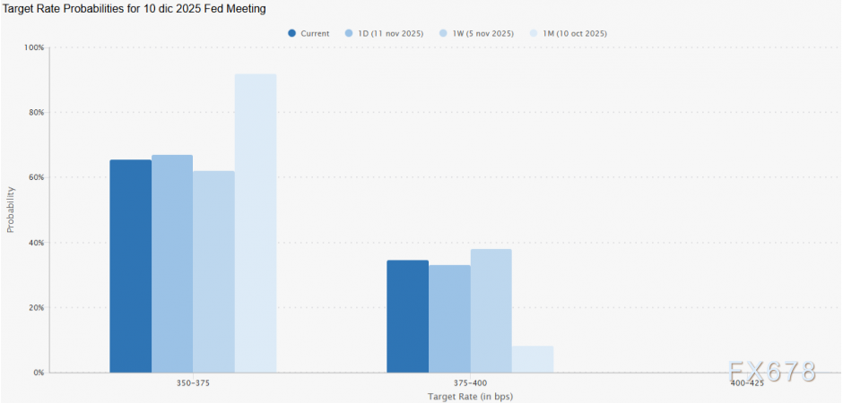距离12月10日美联储货币政策决议仅剩不足一月,CME集团概率模型显示市场仍预期将降息0.25%,基准利率从而从4.00%降至3.75%。虽然一个月前这种降息概率超过90%,现已缓和至65%,但仍反映市场对美联储下次会议年底前降息的强烈预期。
