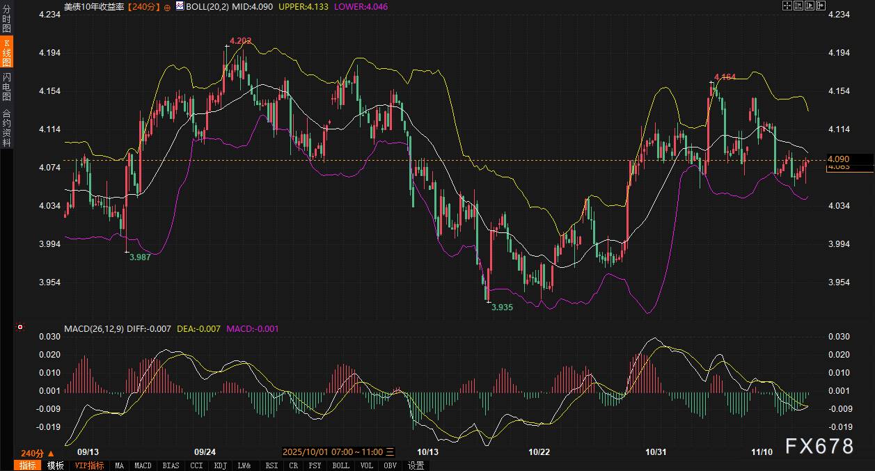 从240分钟图观察,10年期美债收益率正处于一个关键的盘整阶段。布林带(参数20,2)的上轨、中轨、下轨分别位于4.133%、4.090%和4.046%,当前价格在中轨附近徘徊,显示多空力量暂时平衡。MACD指标(参数26,12,9)的DIFF与DEA线均值为-0.007,接近于零轴,表明短期动能匮乏。核心支撑阻力区间已清晰界定为4.05%-4.15%。若收益率有效跌破4.05%(亦是11月5日局部低点),则可能打开下行空间,下一目标将指向4.00%的心理关口。反之,若突破4.15%(布林带上轨及近期区间顶部),则可能引发空头回补,向上测试更高水平。盘中需密切关注该区间边缘的价格反应,以及任何可能打破平衡的FOMC委员讲话或地缘政治消息。